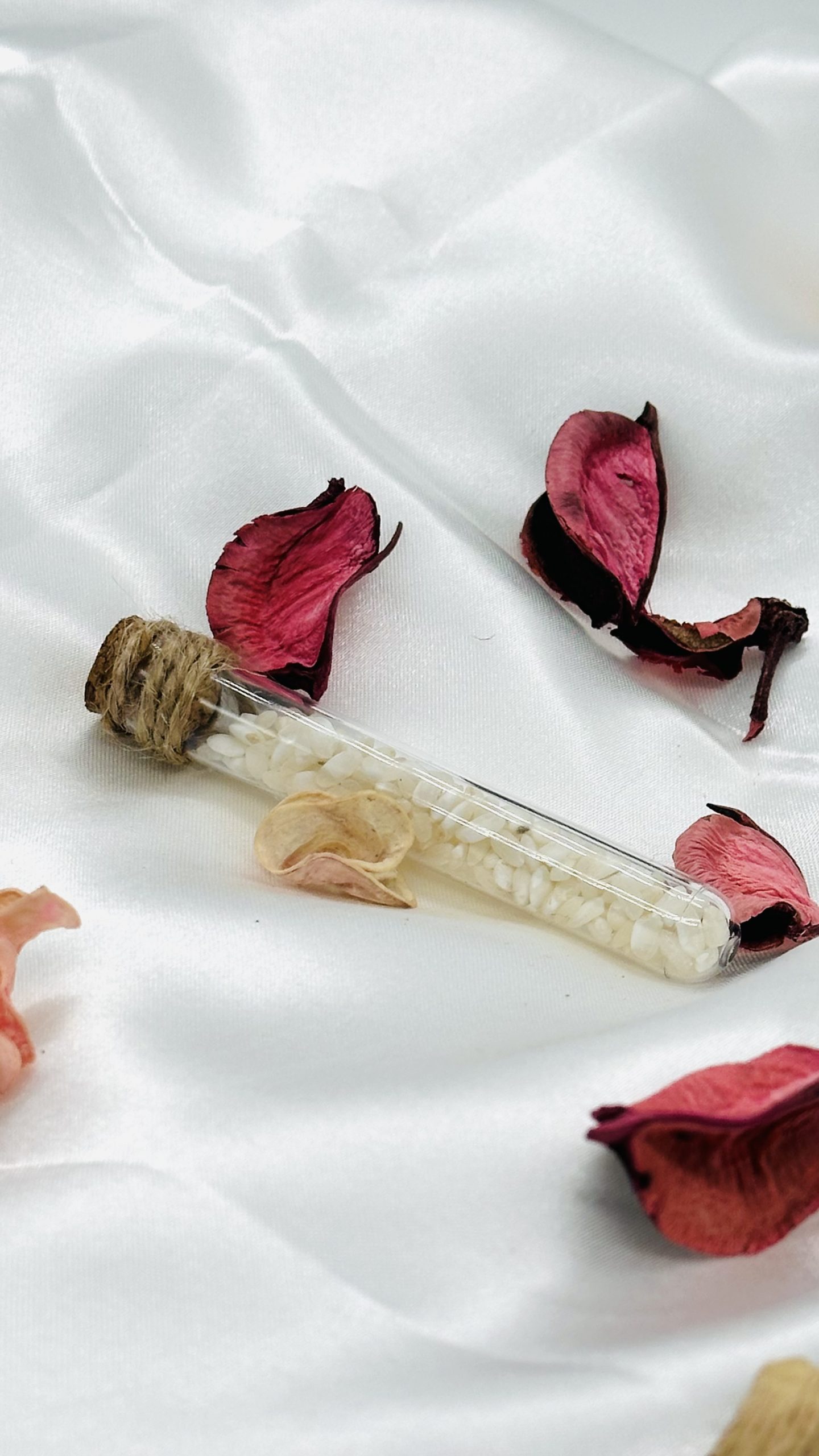 Tubo de ensayo con arroz para que los novios cumplan todos sus deseos.